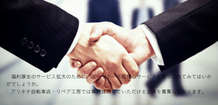 いざキャリーバックやスーツケースが壊れてしまい新しく購入するしかない!と思っている方に、修理やってくれる修理業者を福利厚生のサービスに取り入れる事により社員のやる気作りと、イメージアップのお手伝いが出来るとアリキチ自転車店リペア工房は考えております。