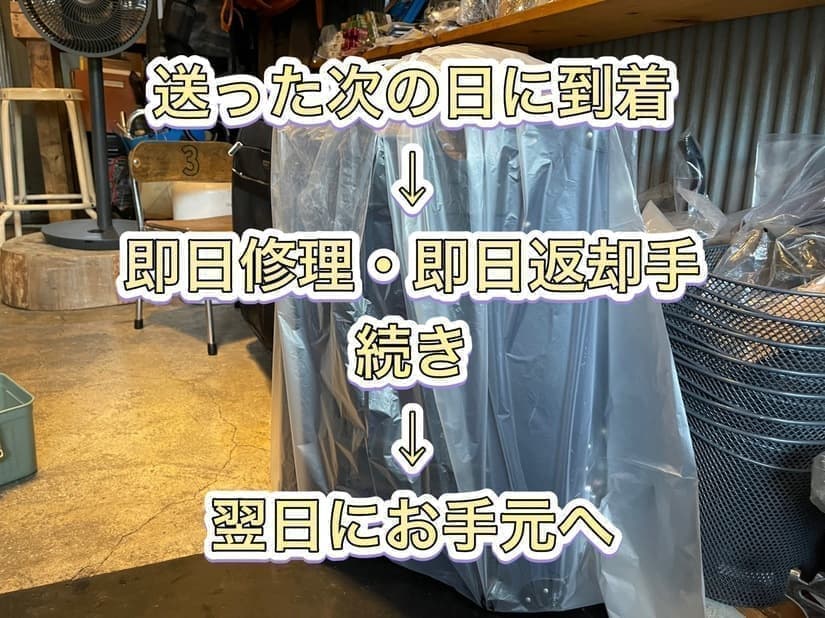 の対応も可能となっております。スーツケース到着後、即日修理し即日郵送手続き致します。お急ぎの方も柔軟に対応致します。お気軽にご相談ください。